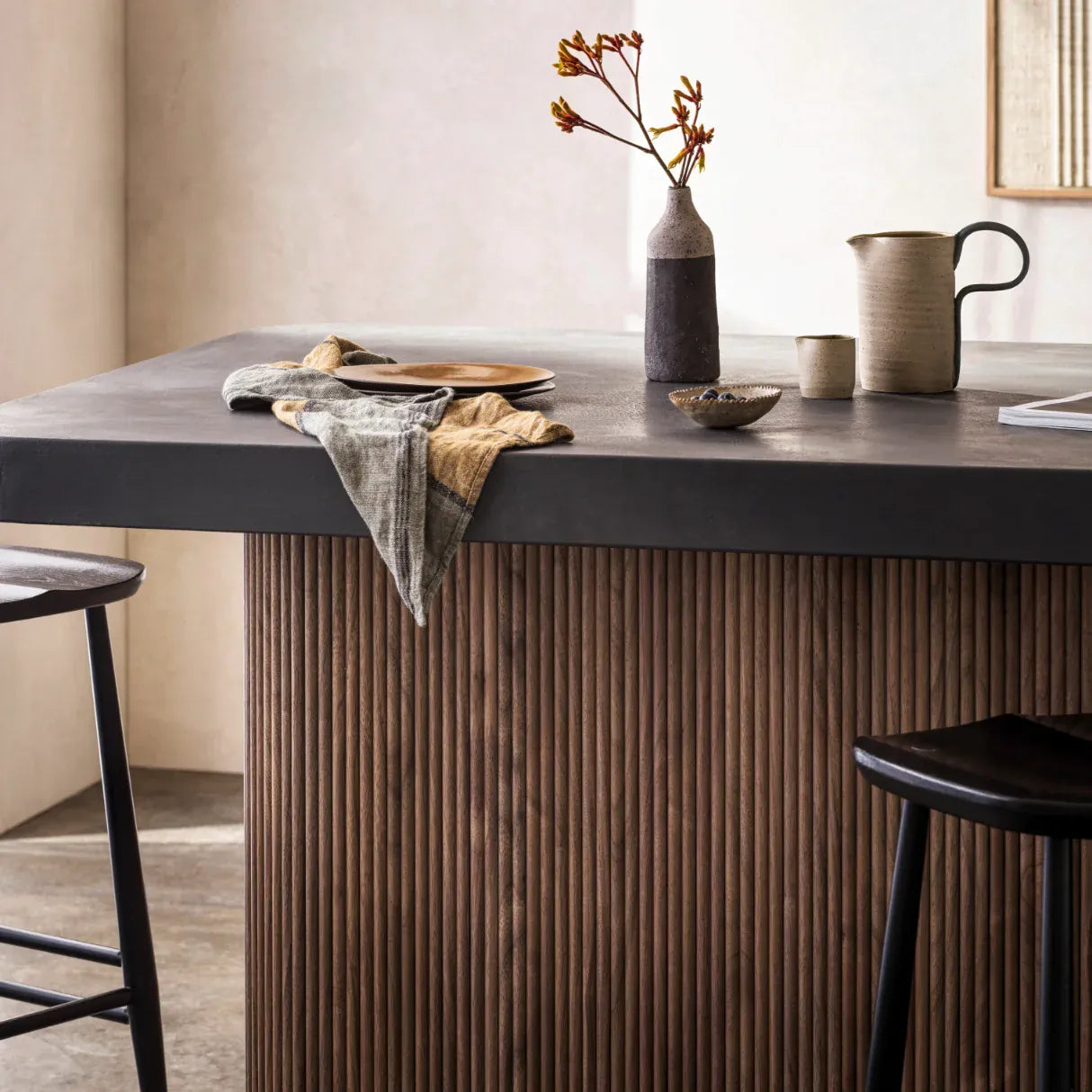 A classic tambour-style profile with evenly spaced vertical slats. Slat offers a timeless architectural look, bringing order, depth, and material warmth to both modern and traditional interiors.